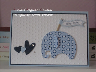 Der kleine Elefant mit dem abstehenden Ohr ist mit der Silhouette geschnitten, ich konnte ihm einfach nicht widerstehen:o)).Der Wimpel ist schon ein kleiner Vorgeschmack auf den neuen Hauptkatalog; er gehört zu dem 6er-Stempelset "Famose Fähnchen", zu dem es dann auch die passenden Stanzen geben wird.Nett, oder?